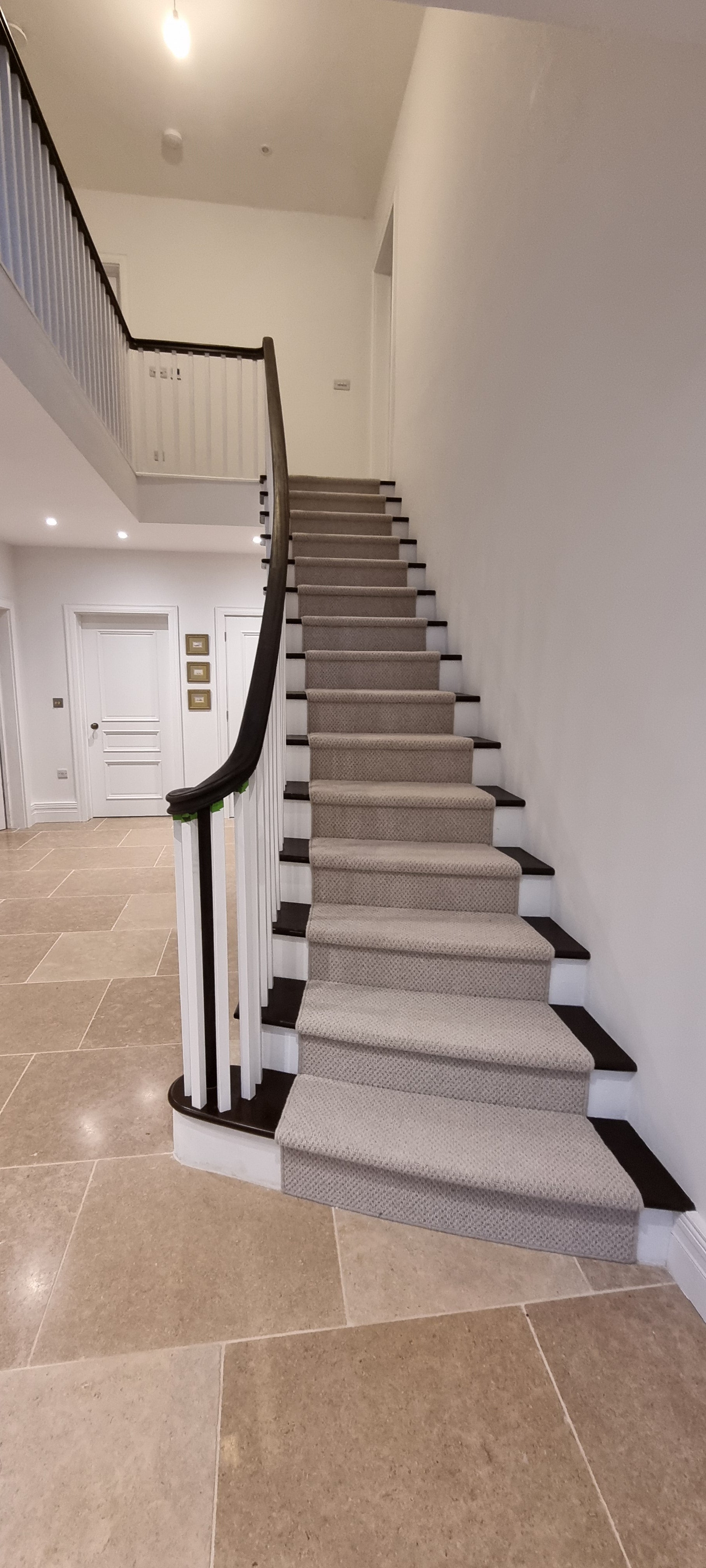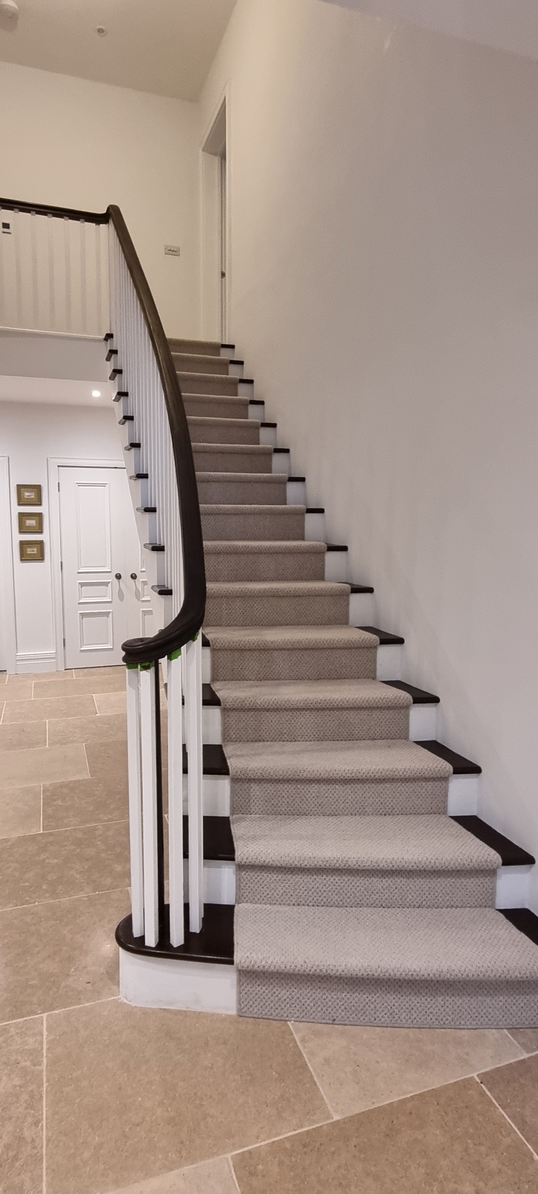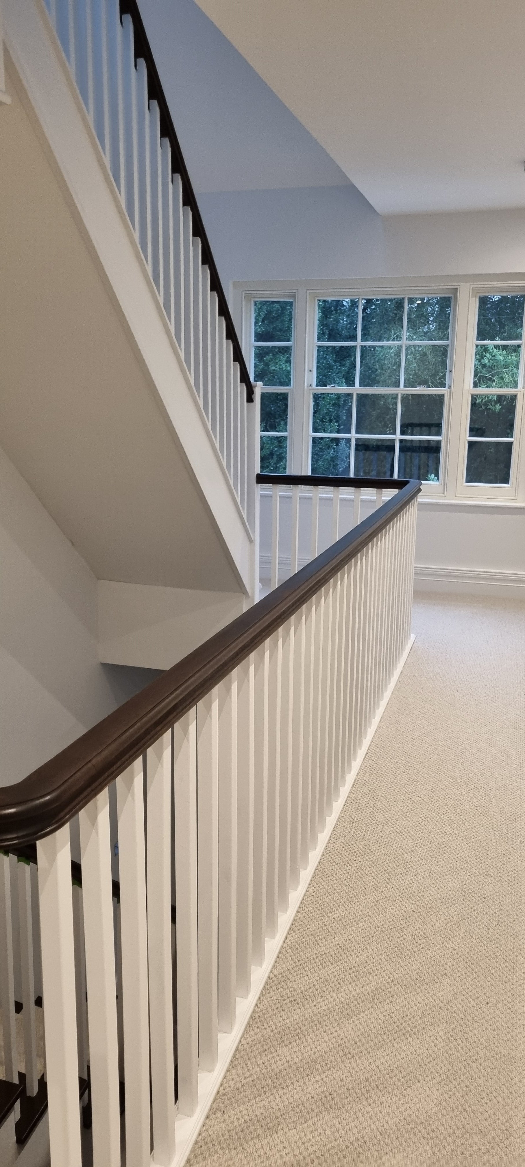 Bespoke Hardwood curved continuous handrail system and Hardwood treads supplied for concrete stairs for a new residence in Hampshire. We also supplied the upper timber staircase with matching balustrading to the second floor and all connecting balustrading on the galleried landing. The New England style Dark stained with white elements make a grand statement to the entrance of this property together with the sweeping curved lower section of the flight.