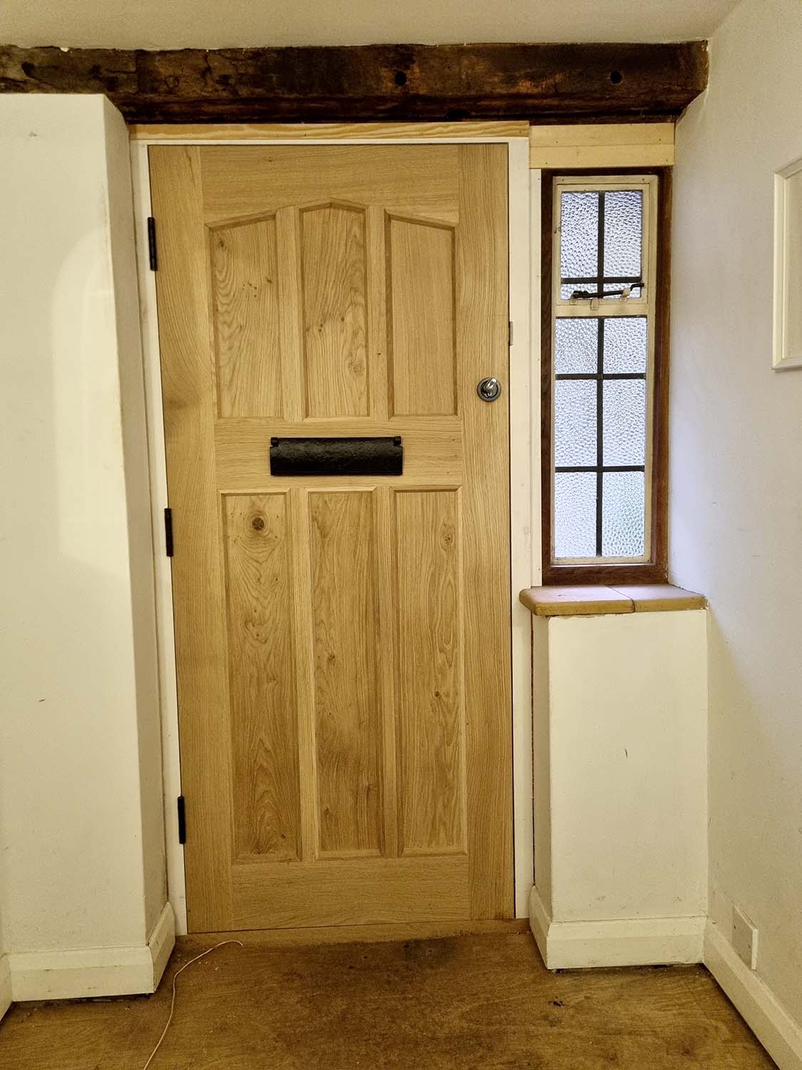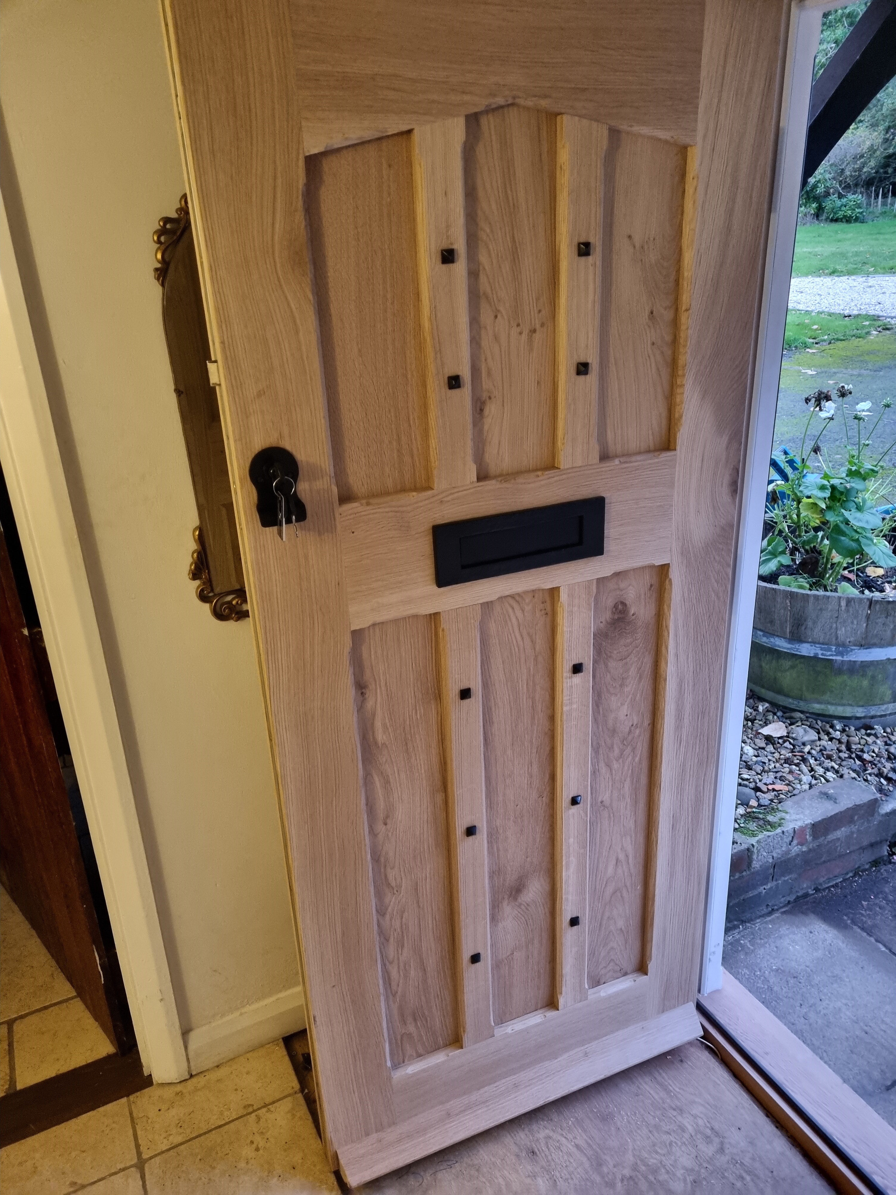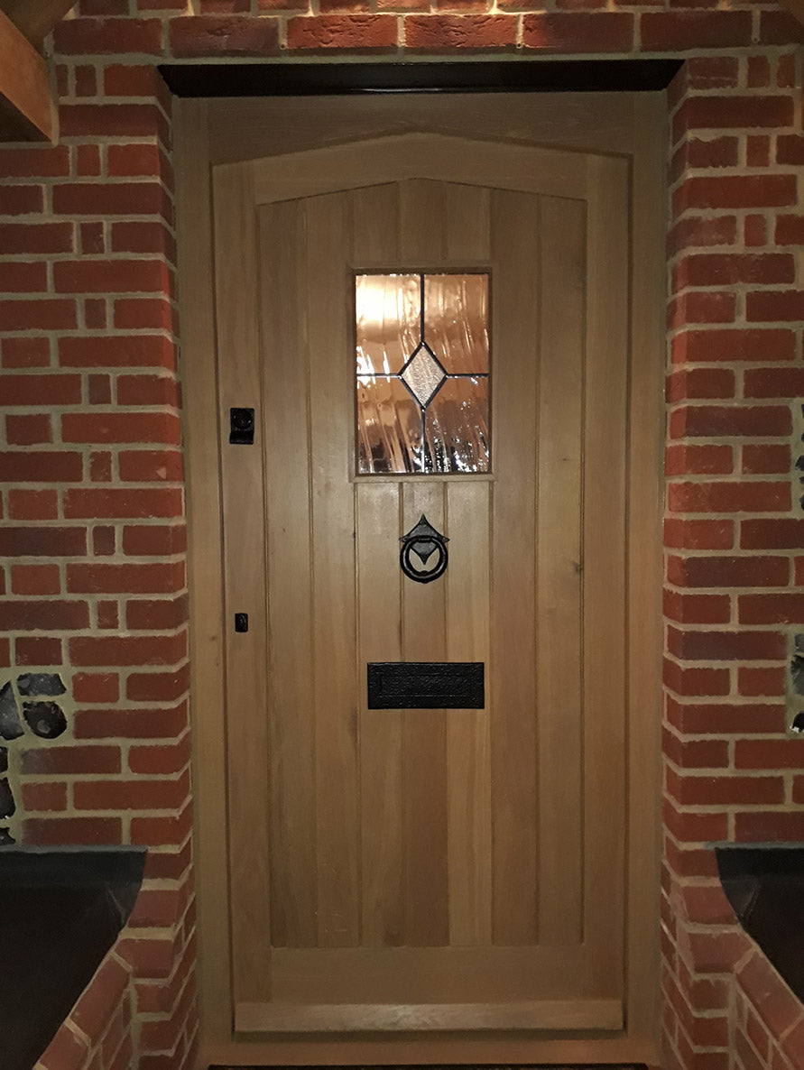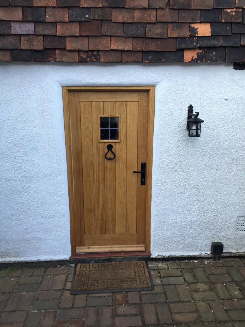 As the property was listed we had to supply a design for the client to be approved by the council. The original black door was only a ledge and brace construction so thin and draughty. The new Oak door is more substantial and fully weatherproofed and fitted with ironmongery supplied from From the Anvil to compliment the age of the property complete with antique black studs to give that Tudor feel.