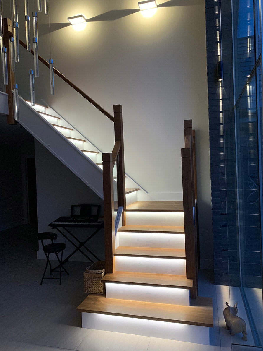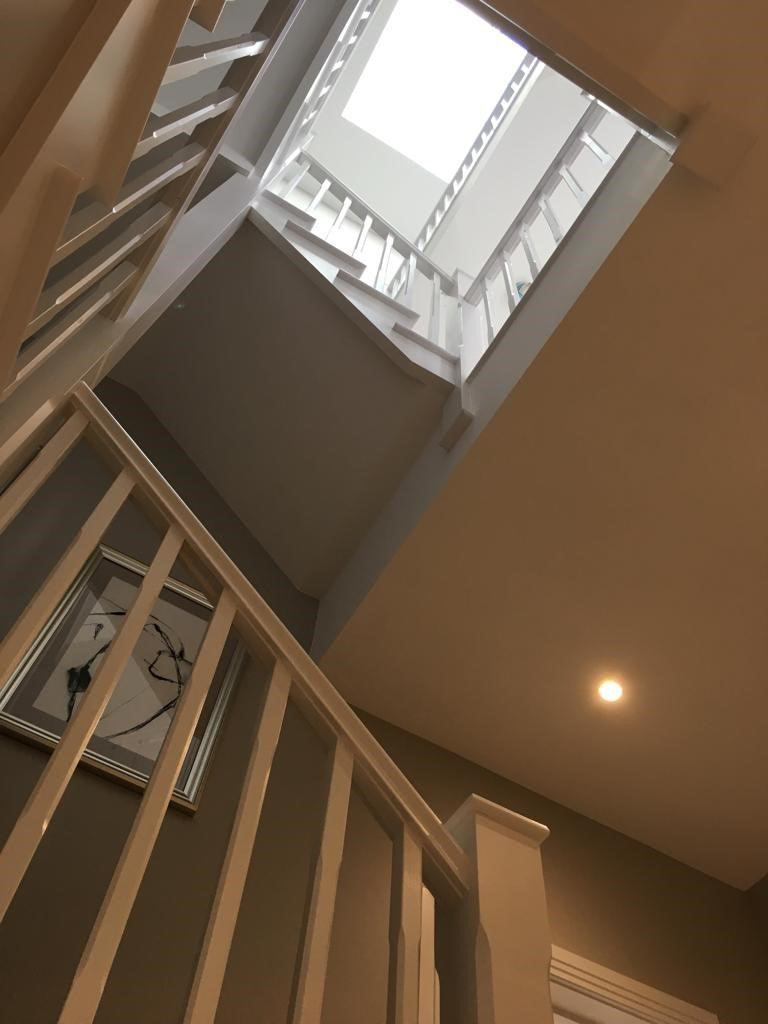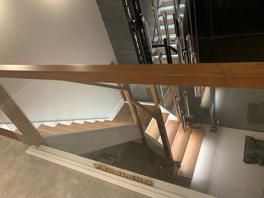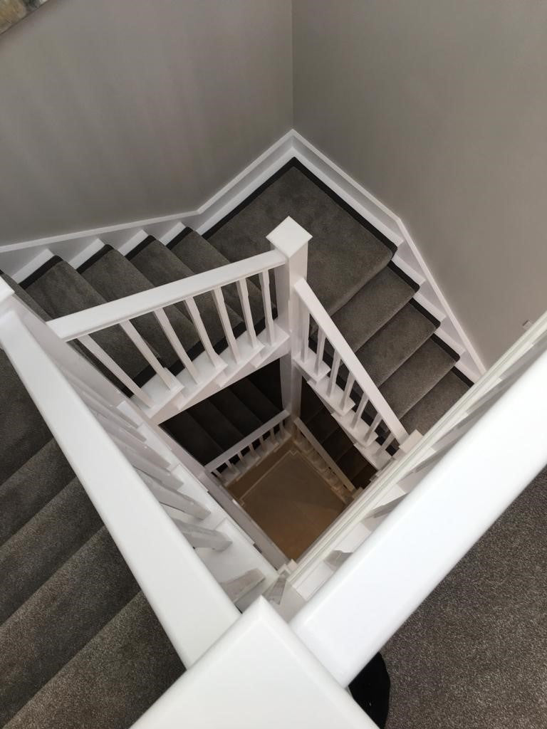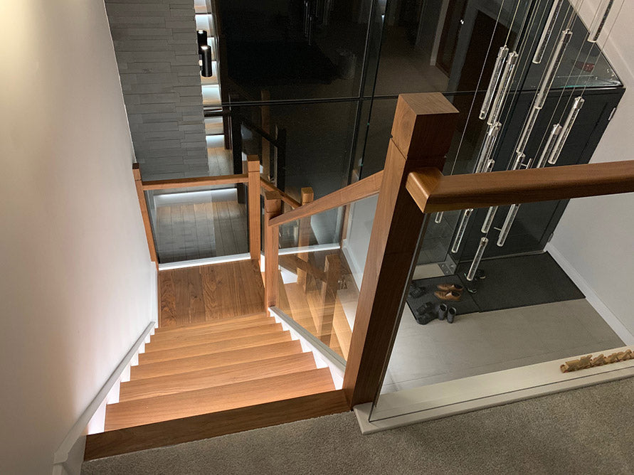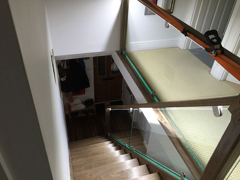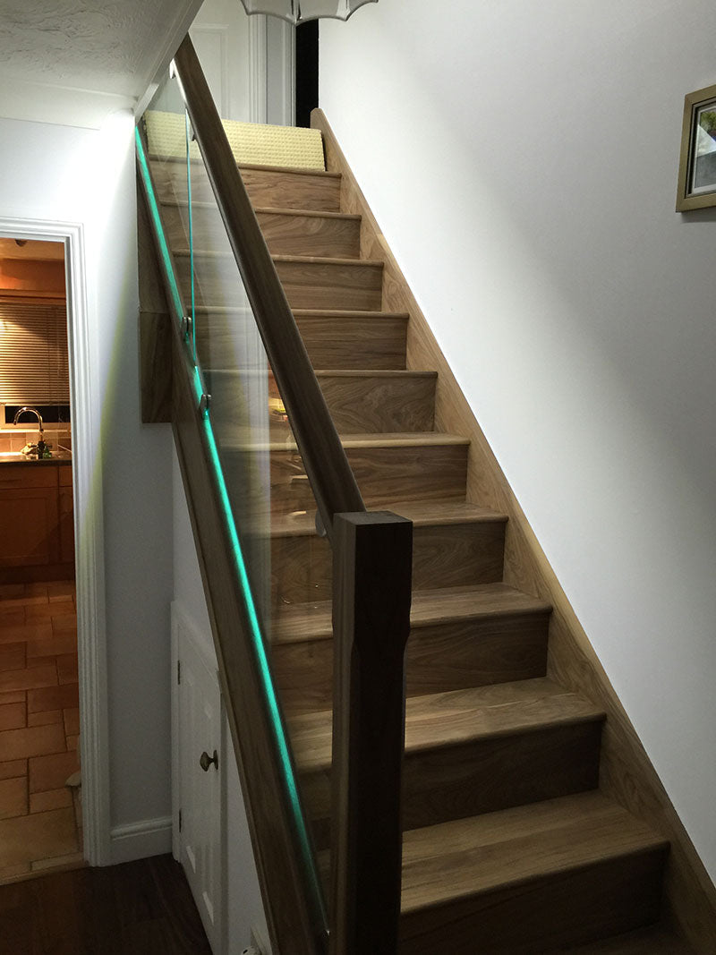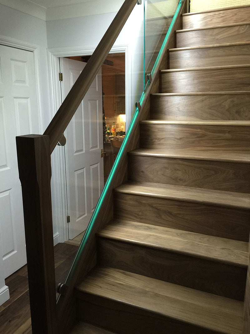 Stunning contemporary American black Walnut and softwood painted staircase supplied and installed to a new build property in Hurst. The clients wanted clean lines with grooved in glass balustrading, routed newel tops and lighting under each tread which we grooved out in preparation for the led light strips supplied by the client.