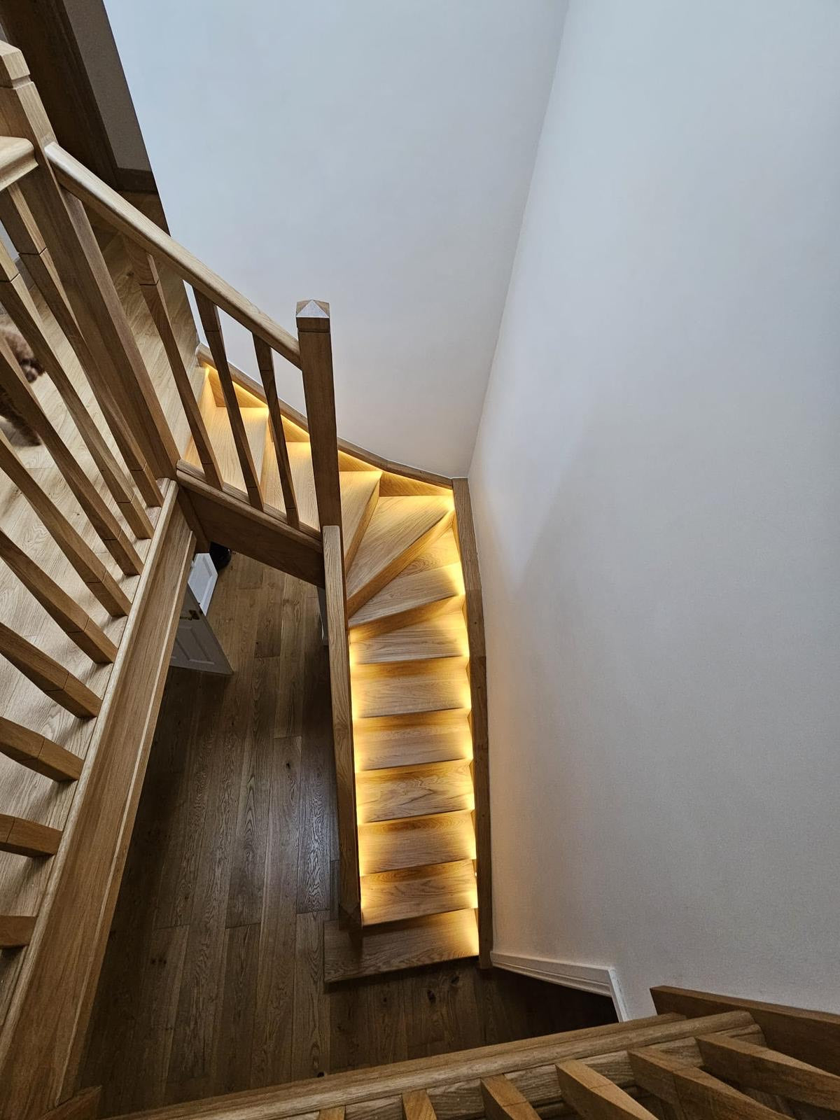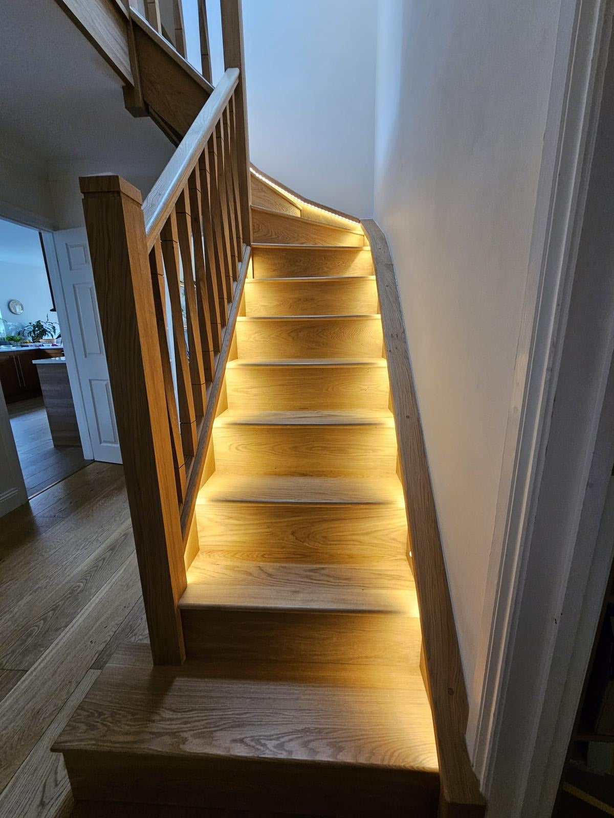 Beautiful Bespoke Oak staircase supplied and fitted to a residence near Reading. The client originally was just going to change the balustrading but after discussing the options they opted for a complete new flight of stairs where they could also integrate new led lighting. We shaped the newel top and added a groove detail around the newels to compliment the twist style spindles. The overall results are stunning and client was happy to share the photos once the decoration had been completed.