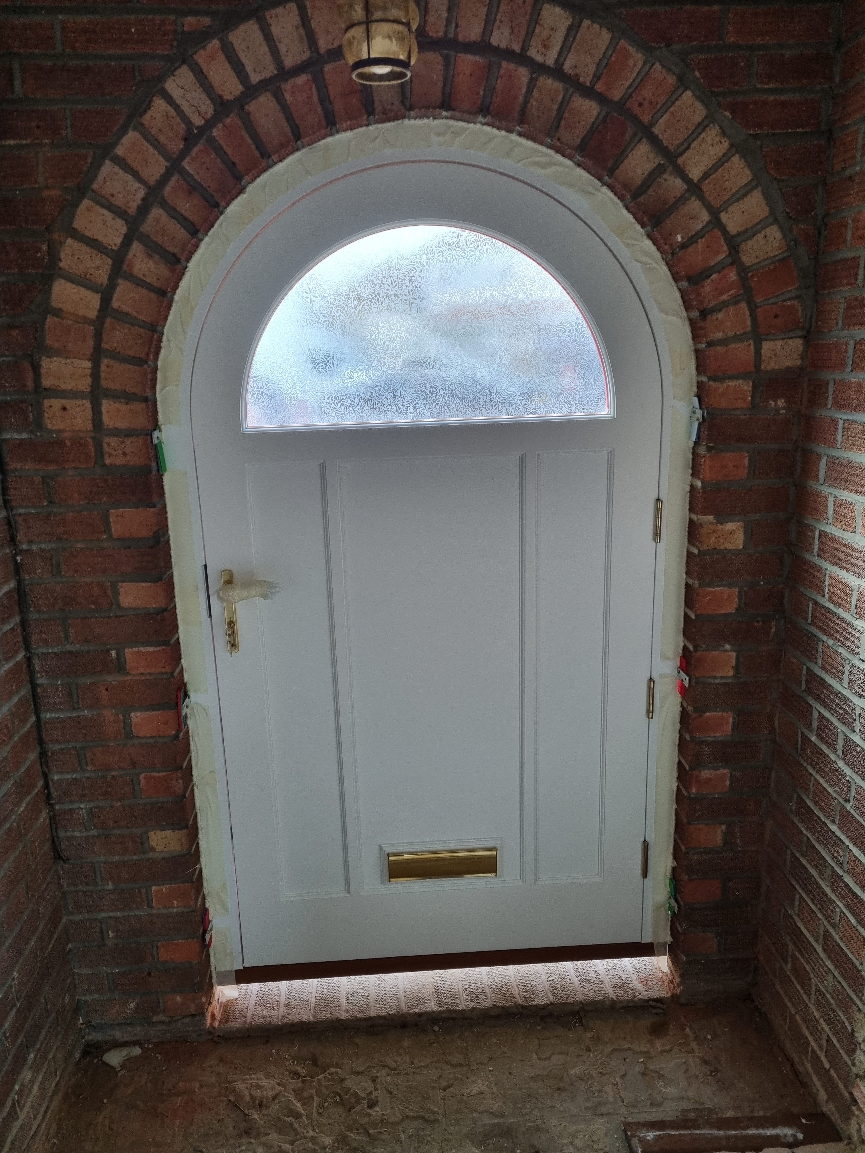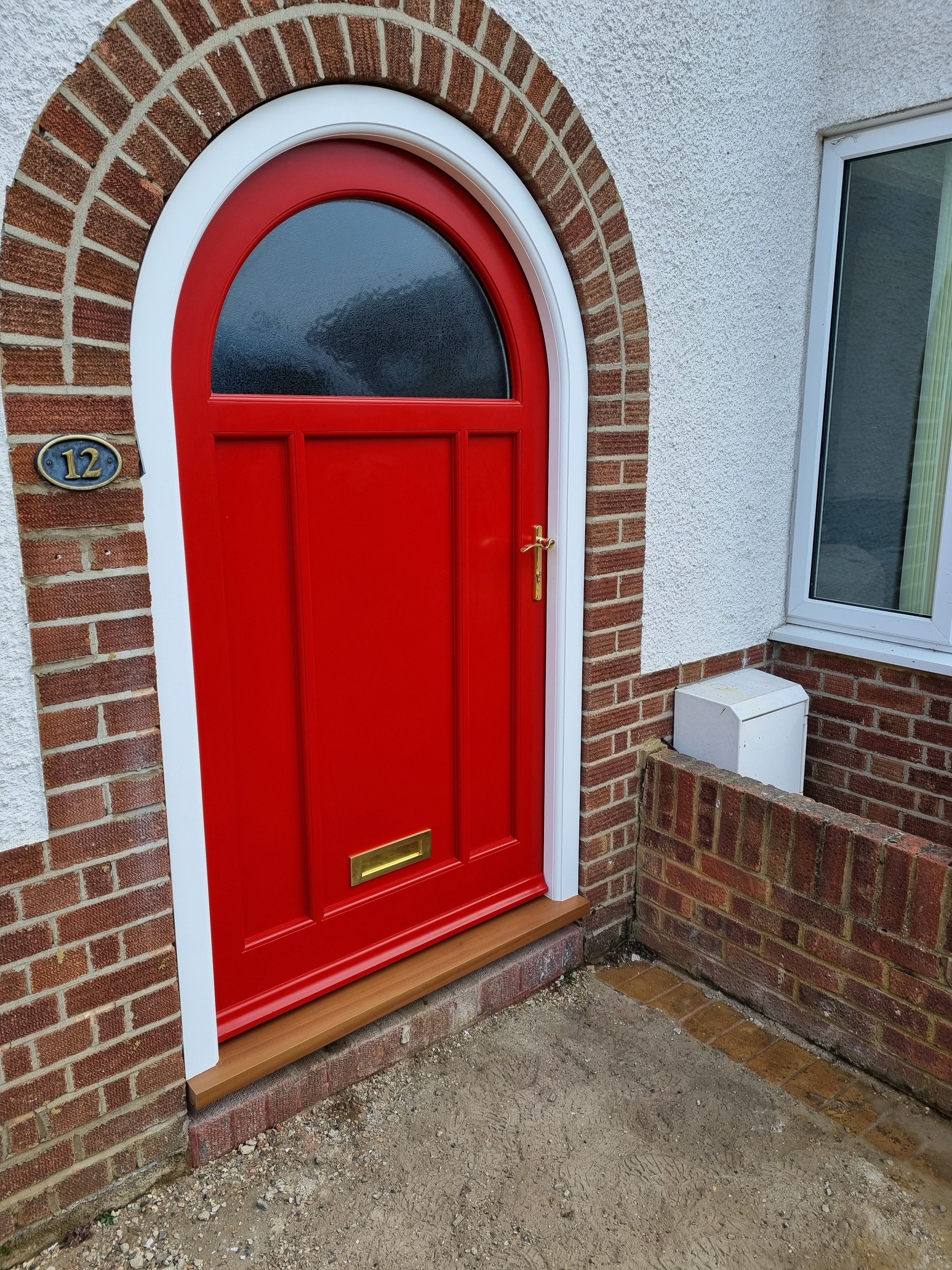 Beautiful curved Period style front entrance doorset supplied to a property in Windsor. The set was pre-finished with a white frame and dual colour door with Signal Red externally and white internally and with Chantilly Obscure double glazing to the top light. The door was pre-hung and fitted with a multi-point espagnolette Locking system with gold handles, letterplate and accessories.