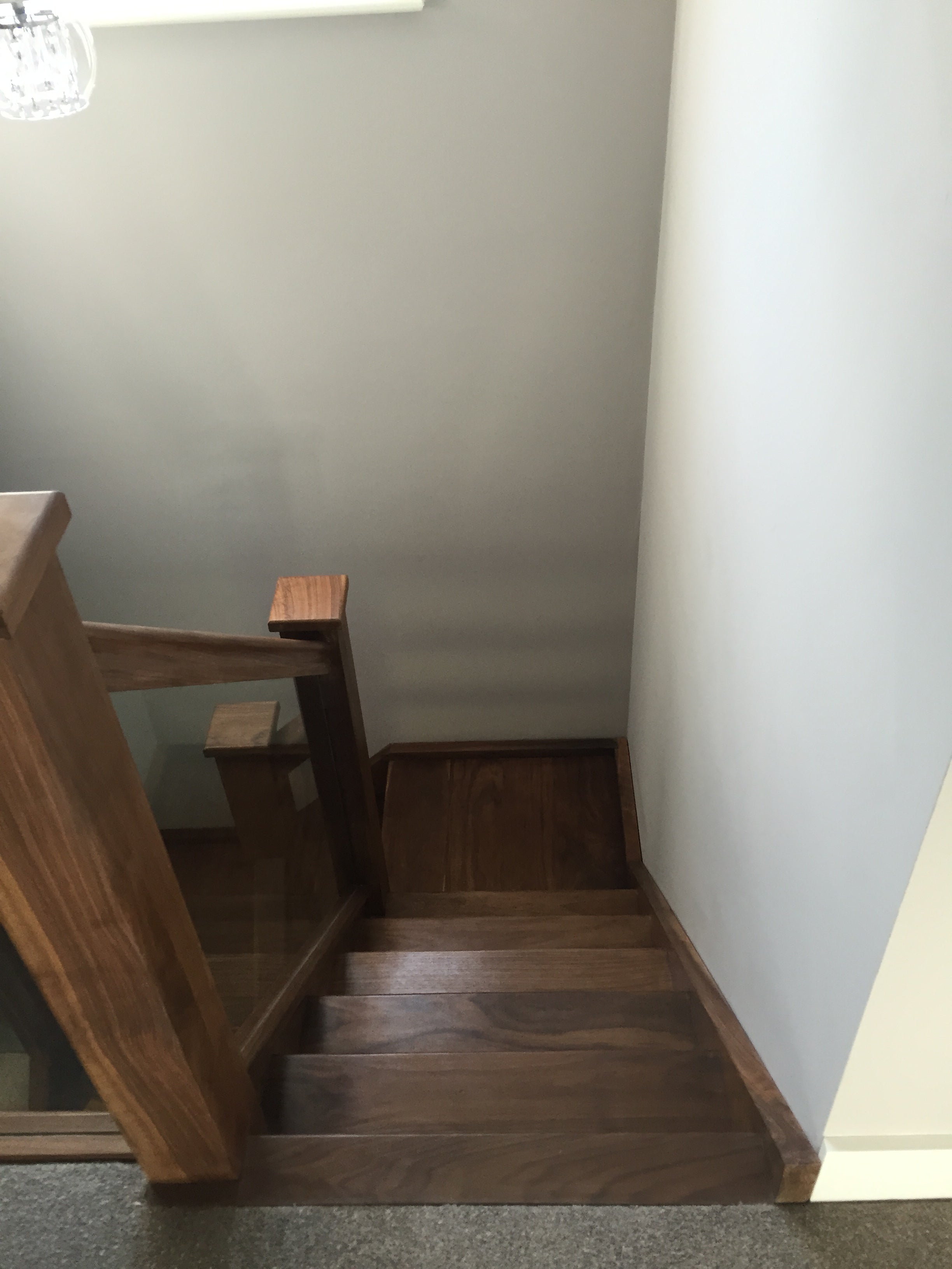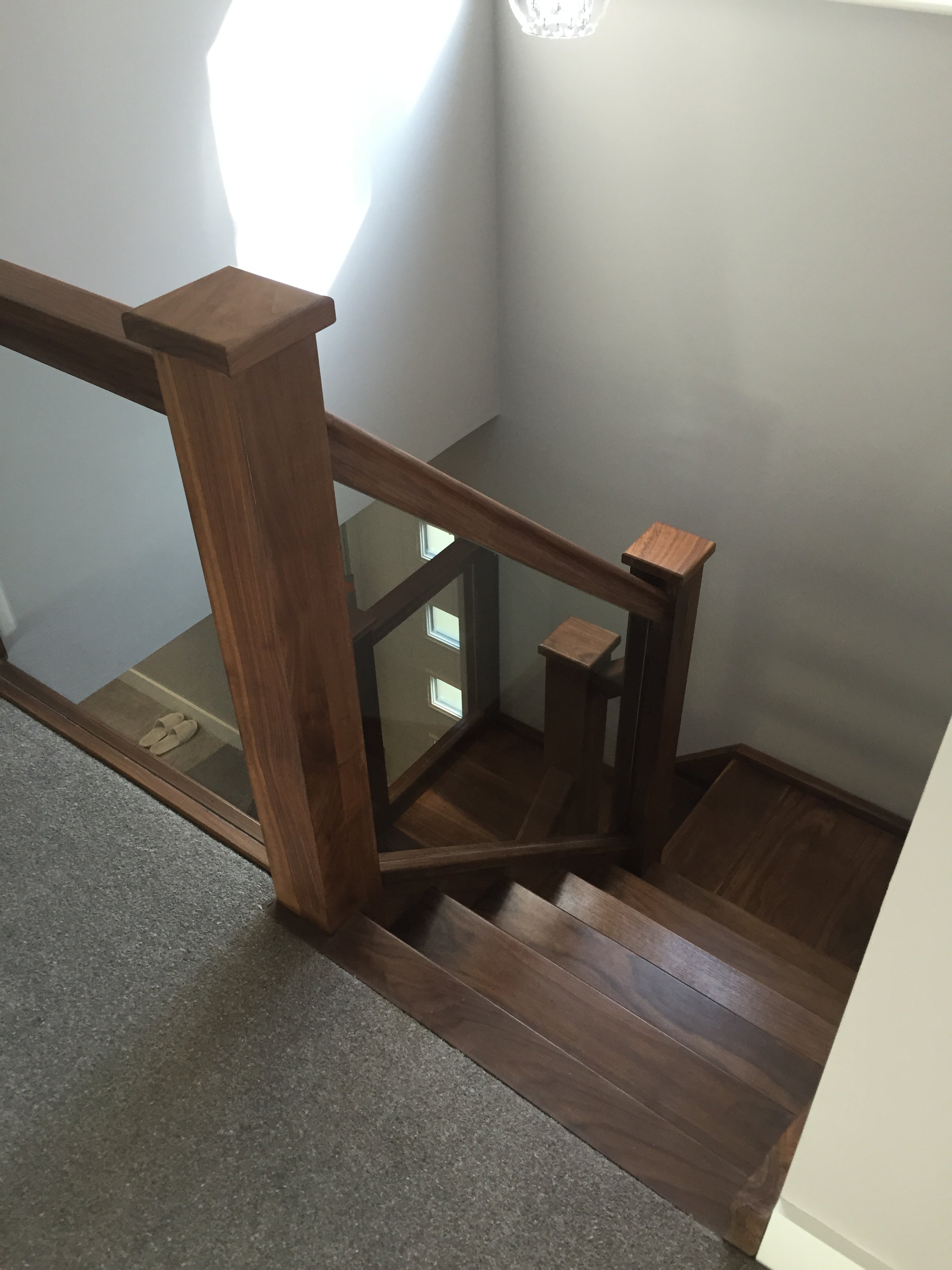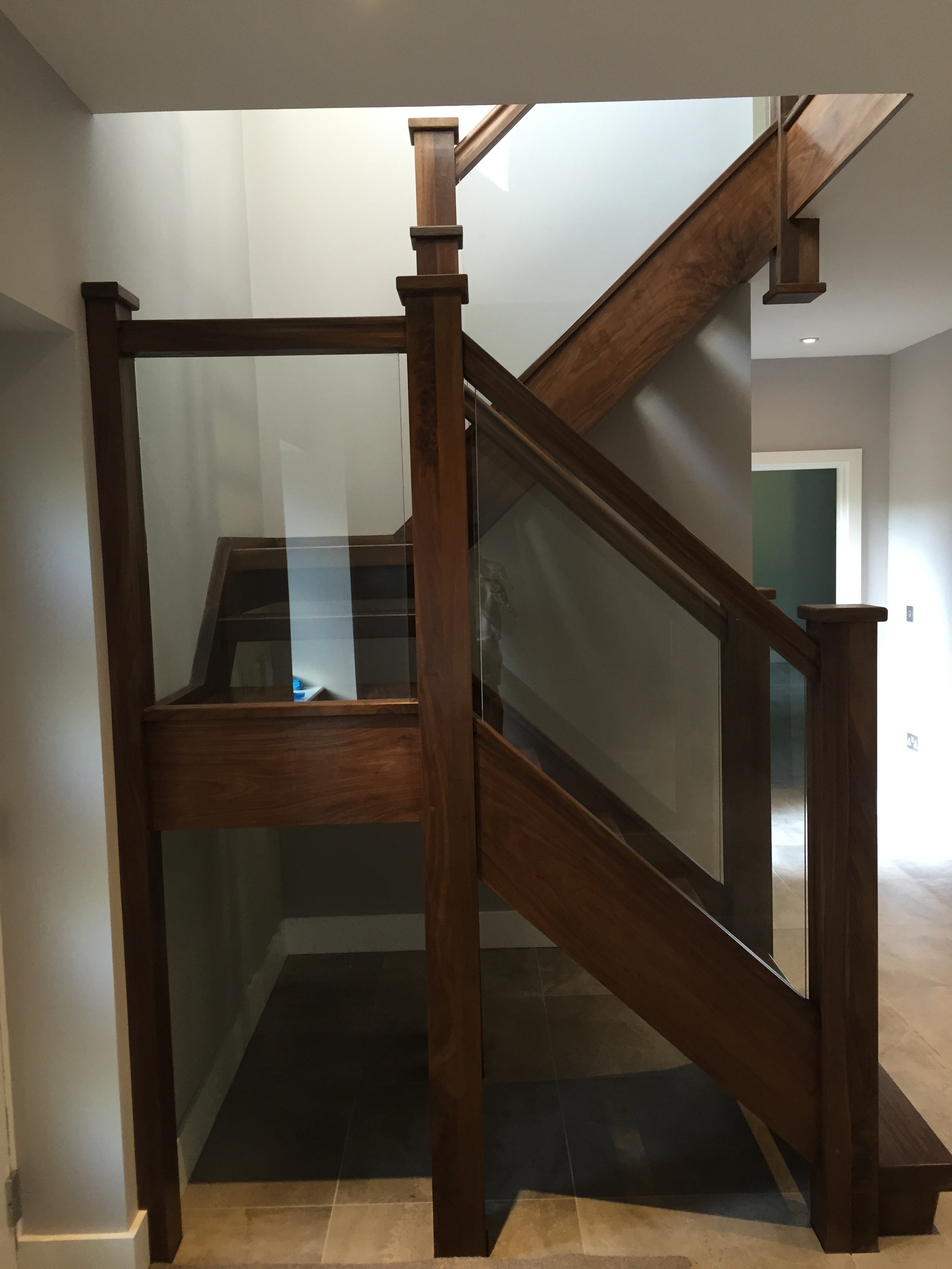 This was our clients second flight from us for a new property being constructed in Leatherhead. He was looking for something special and wanted a "Chunky" feel to the flight. We supplied a beautiful American Black Walnut open riser flight with Ex 50mm strings, Ex 75mm treads, 120mm x 120mm square newels and a 100 x 75mm handrail, with the glass balustrade grooved into the handrails and baserails. After the flight was installed he emailed us to say "Hi Stuart, Really impressed with the quality hope these pictures are ok, Regards Lee