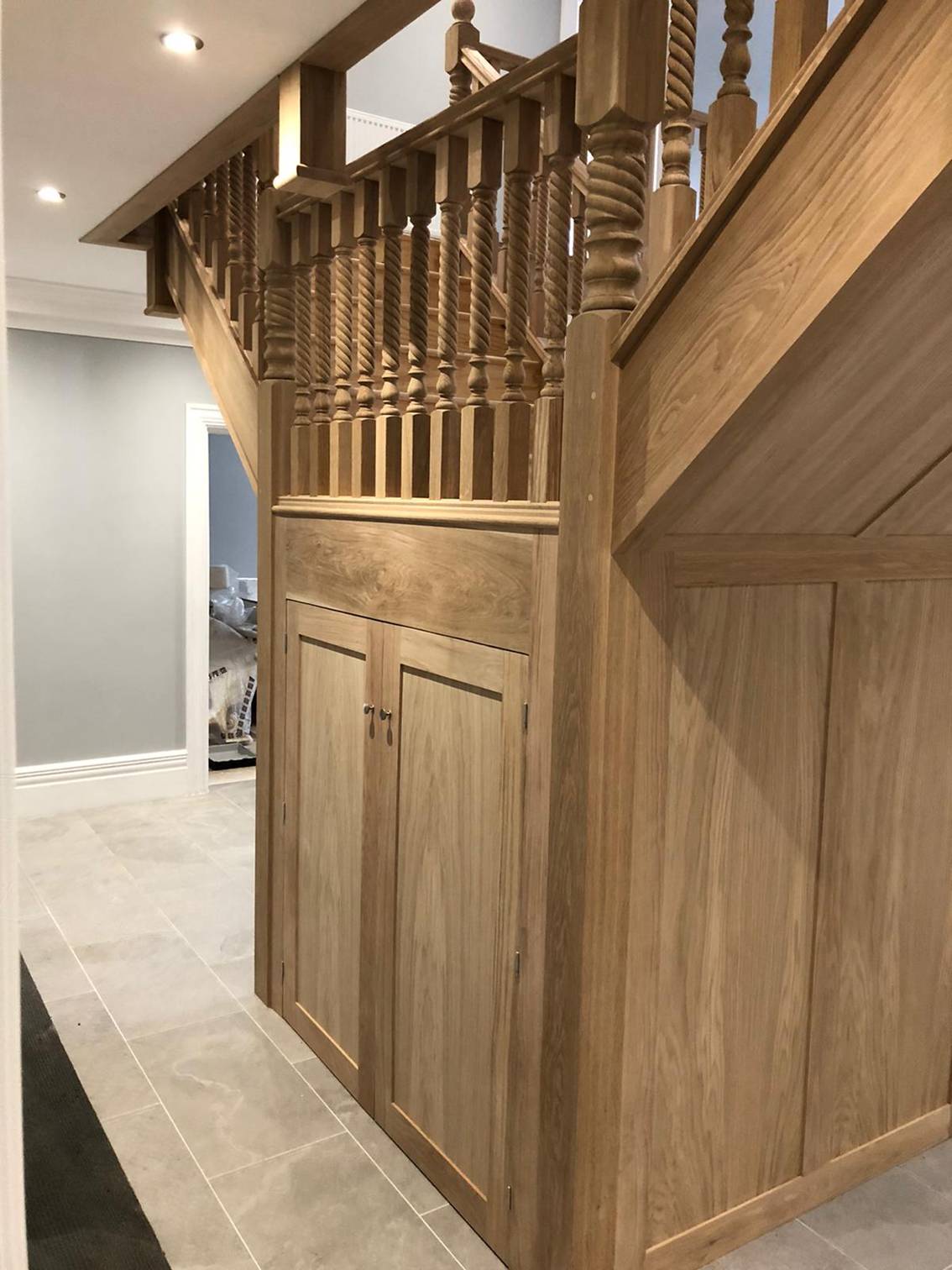 Stunning double flight over flight oak staircase supplied and fitted to a private residence in Finchampstead. Complete with 120mm X 120mm barley twist newels and 55mm barley twist spindles and a 100 X 75mm moulded oak handrail, complimented with under panelling and under-stairs cupboard space. The lower flight is a T shaped design with an extra wide bottom section to give a grand feel to the entrance hallway, with the upper straight flight servicing the second floor, but with continual balustrading from top to bottom.