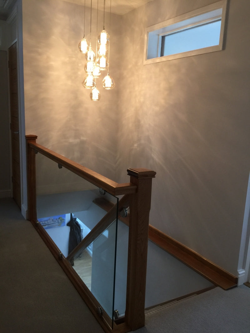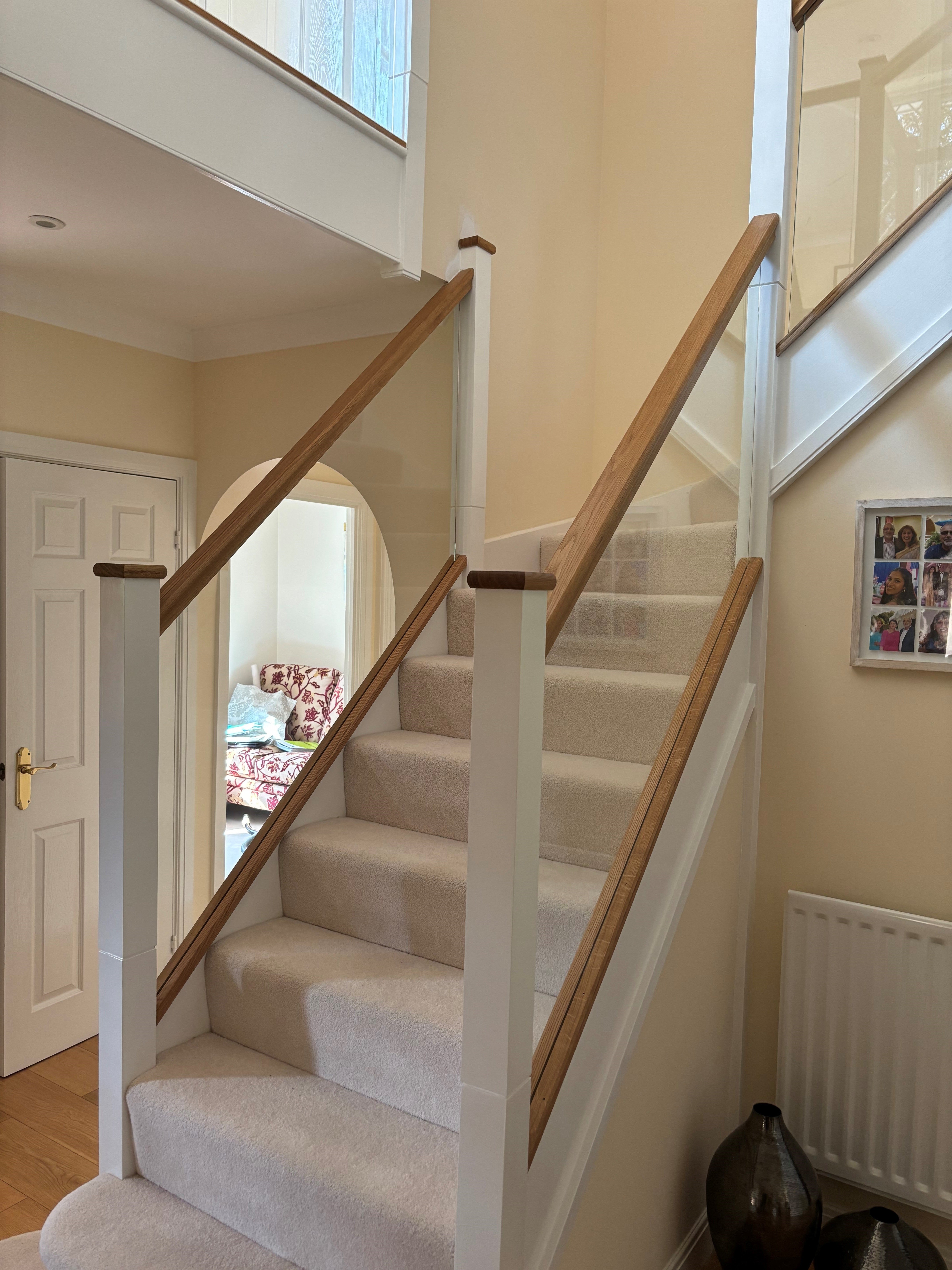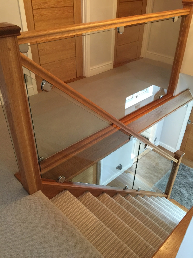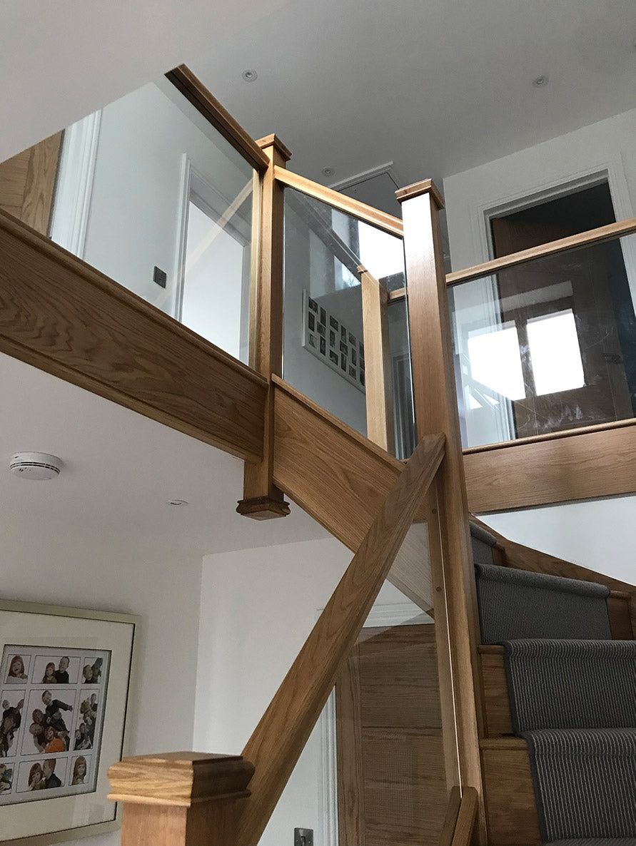Our surveyor suggested cutting off the newels at the bottom creating a shadow gap detail for the new newel tops to give some detail at the joint and then adding some Oak handrails, base rails and newel caps, and glass balustrading grooved into the handrails and base rails.