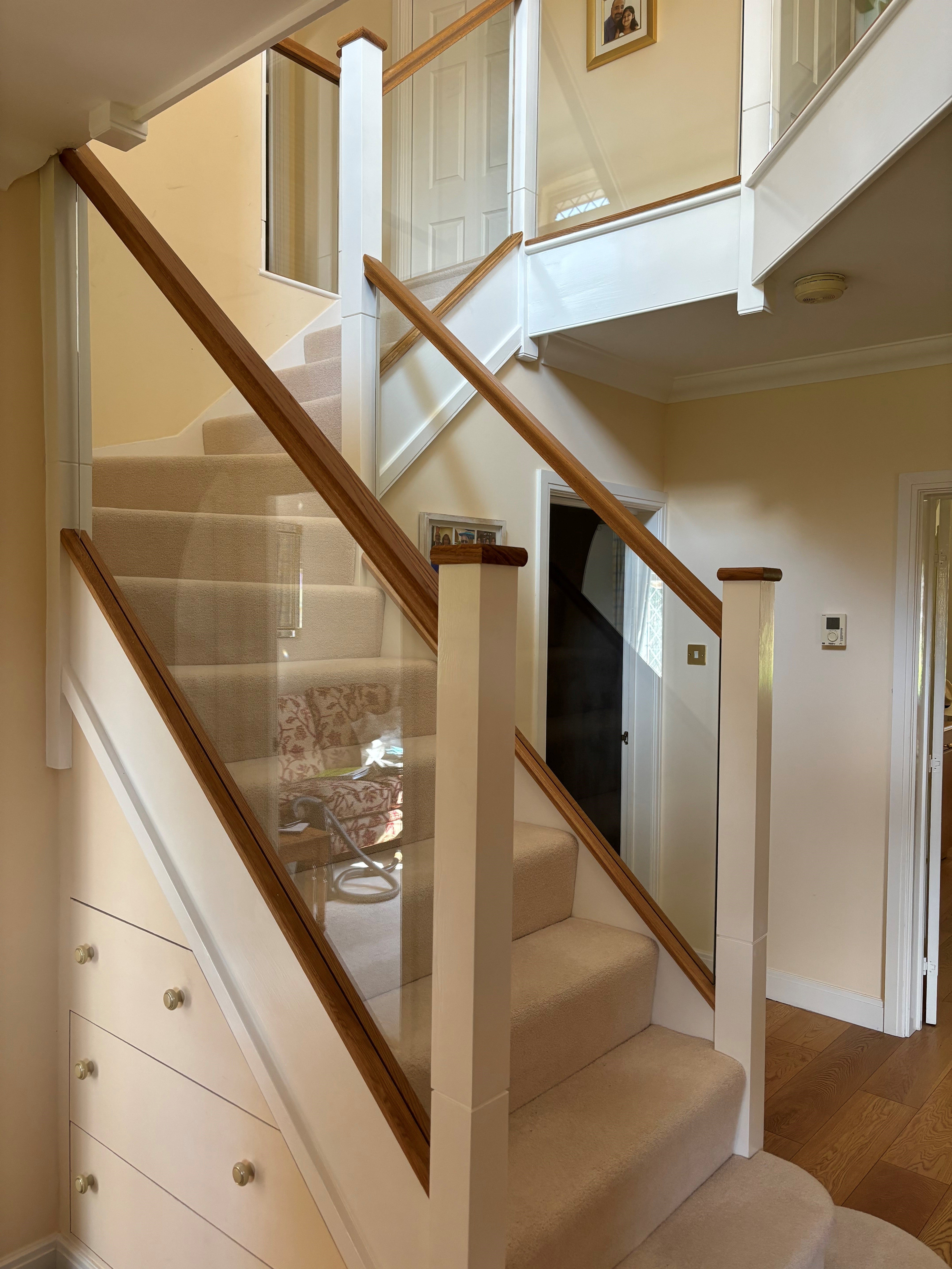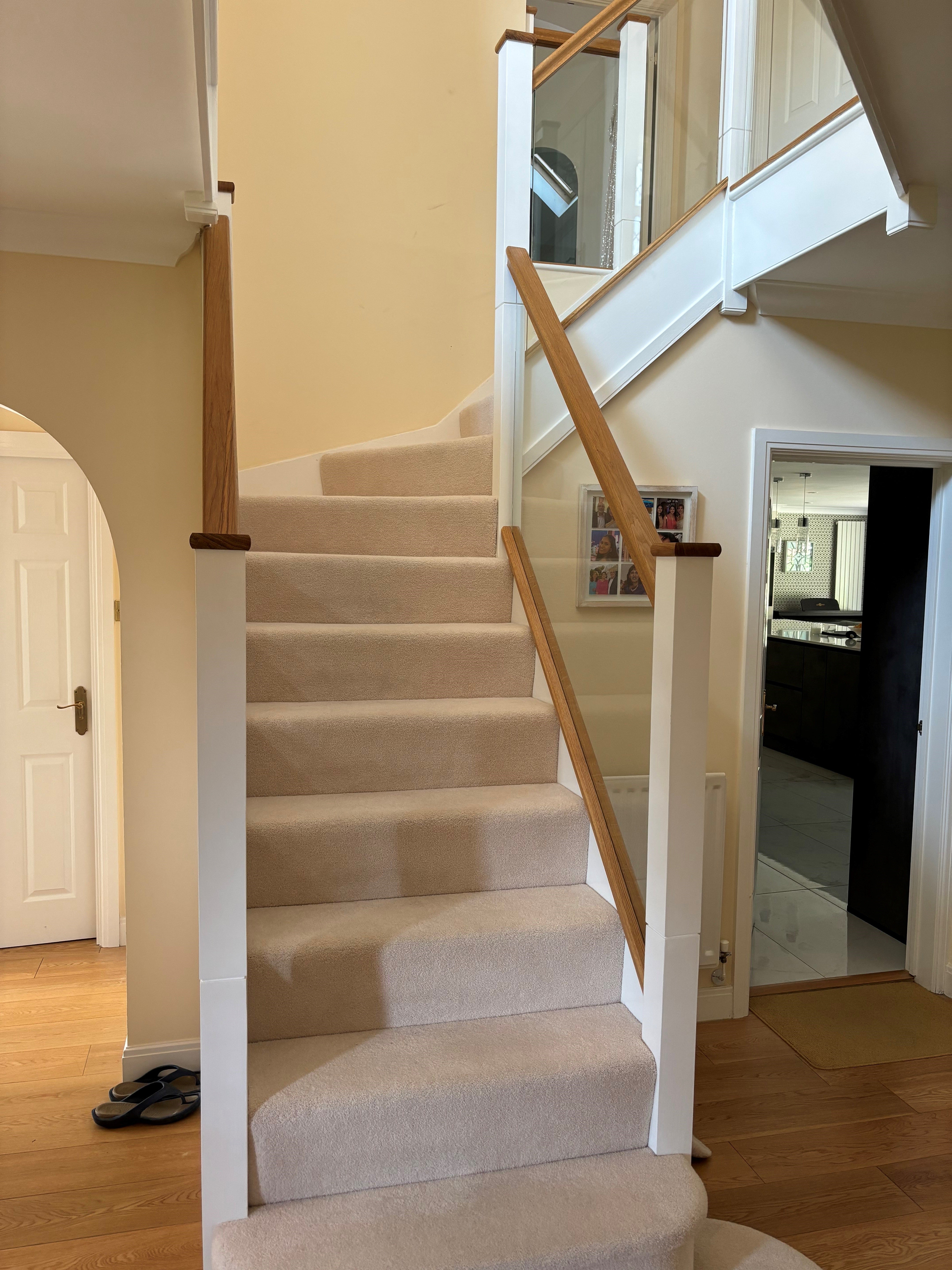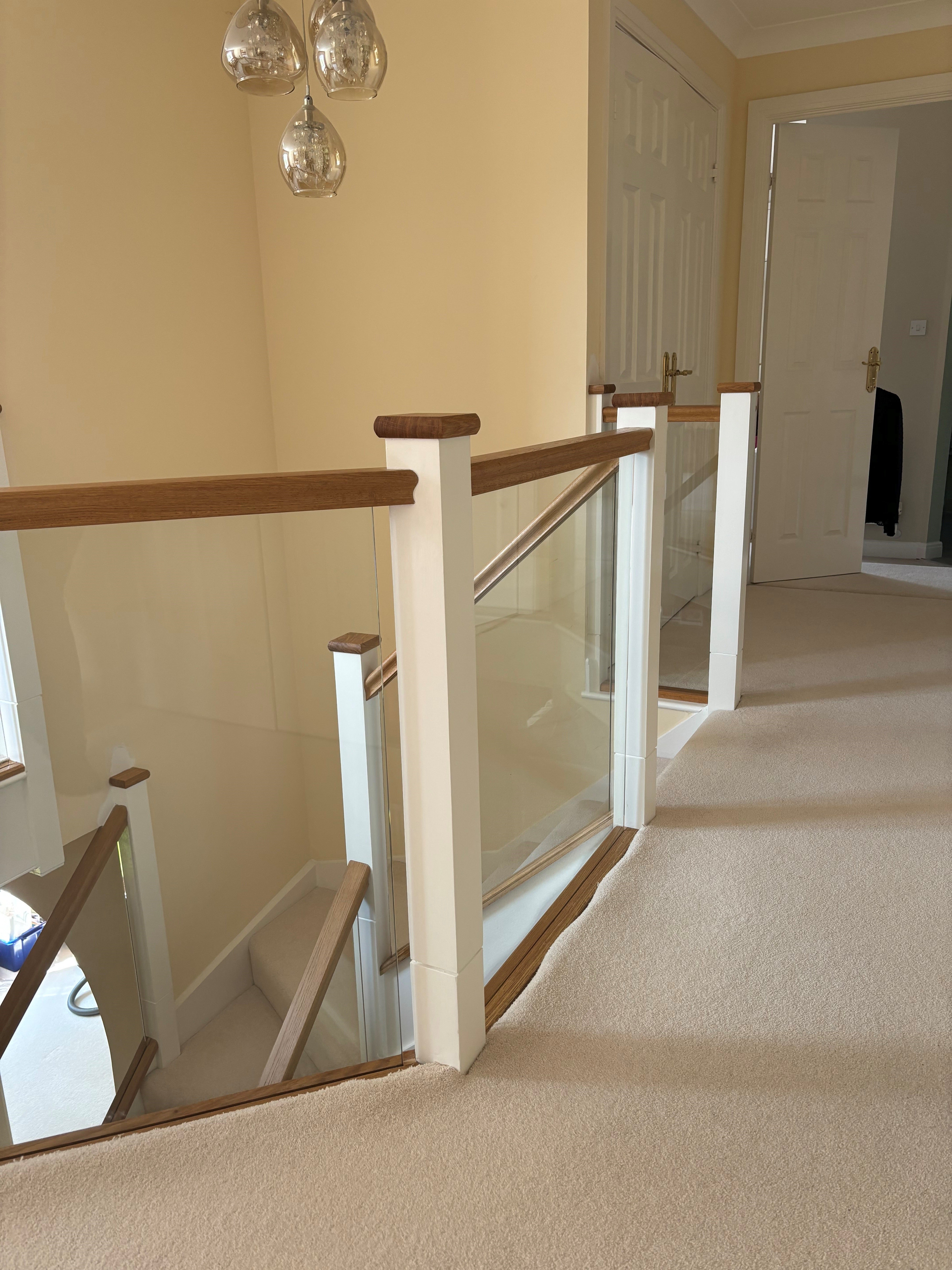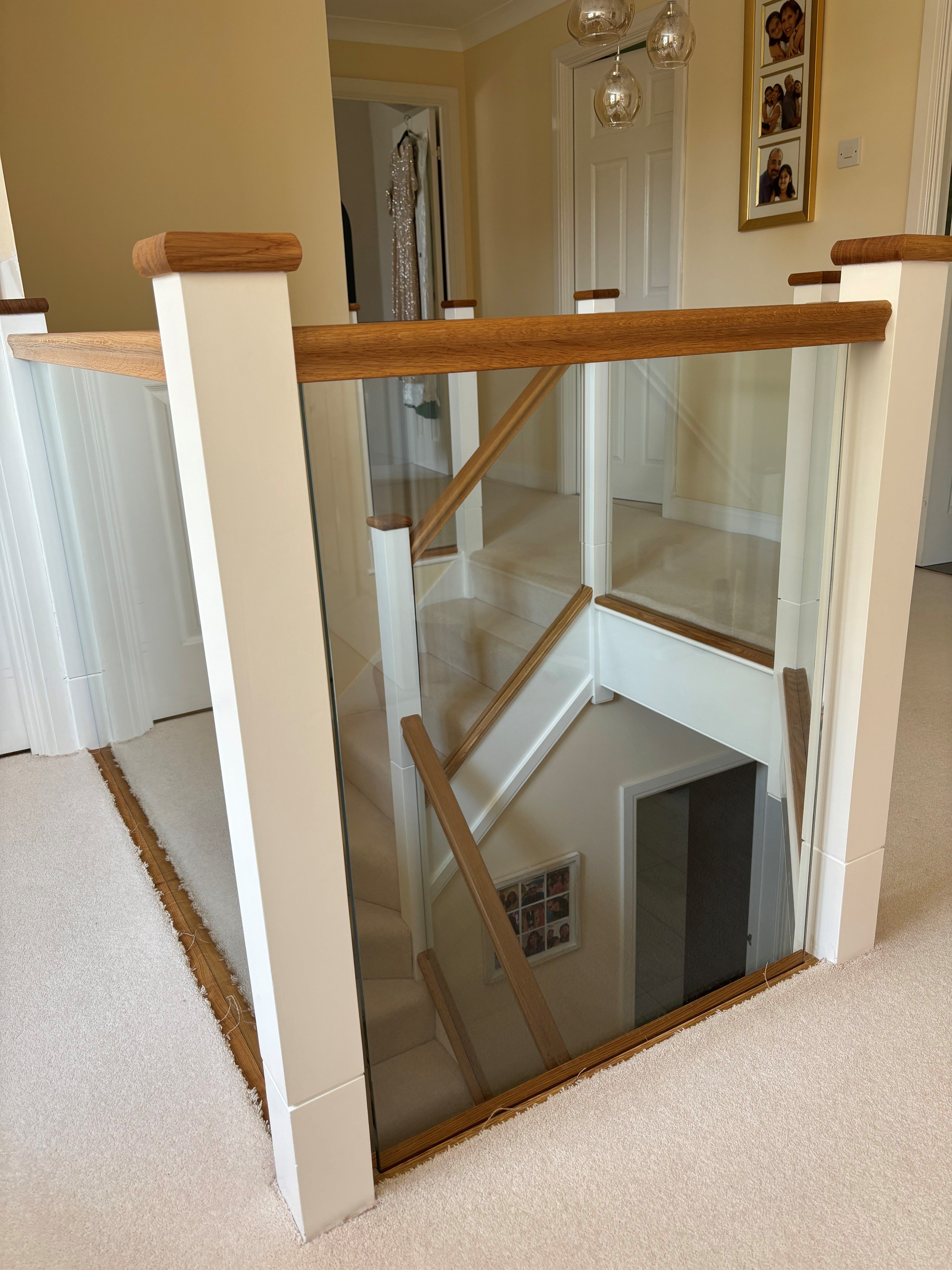 Our surveyor suggested cutting off the newels at the bottom creating a shadow gap detail for the new newel tops to give some detail at the joint and then adding some Oak handrails, base rails and newel caps, and glass balustrading grooved into the handrails and base rails.