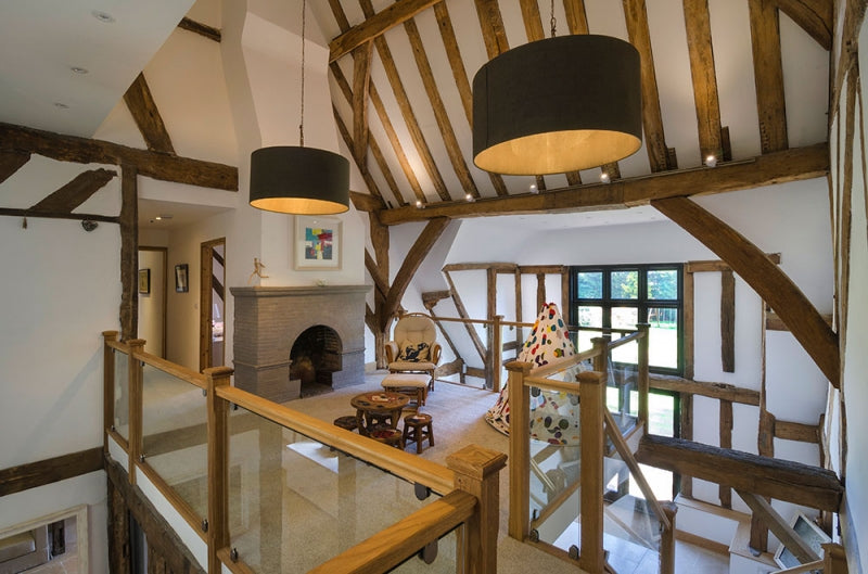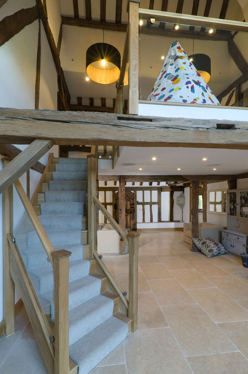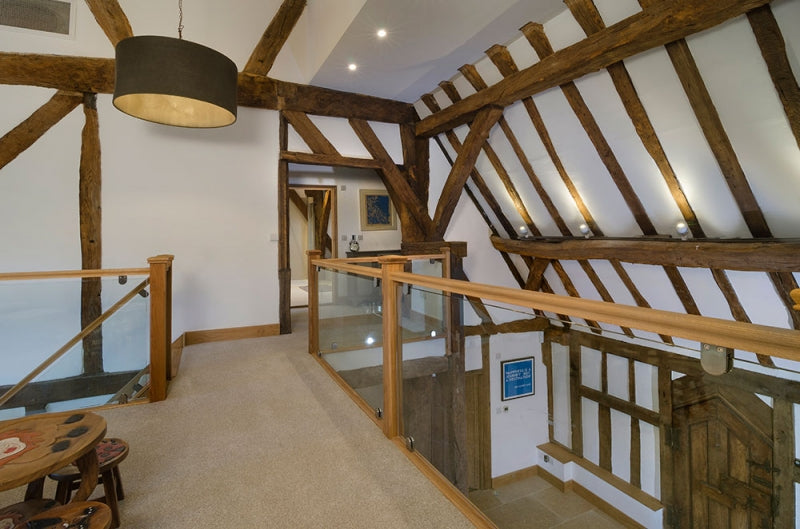 After numerous consultations with our clients they settled on a solid Oak staircase complete with oak treads and risers, a simple stop chamfered newel design and 10mm glass balustrade on brushed chrome brackets to make a beautiful addition to this wonderful period barn. As you can see from the photos they made great use of the space on the first floor to create a fabulous galleried landing.