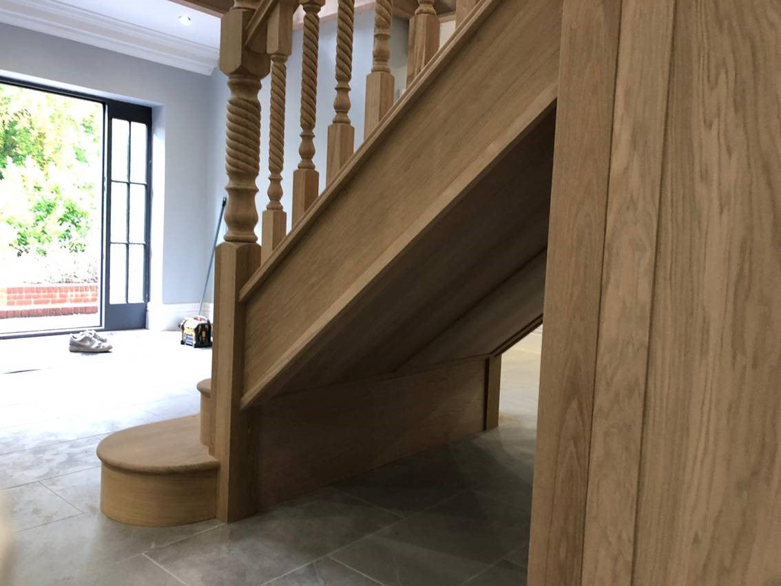 We supplied and fitted this beautiful cut string solid Oak curved flight of stairs to a multi-million pound property in Yateley. The bottom string curves out to give the effect of a much wider stairway when you enter the hallway. All the newels and spindles were increased in thickness to add to the grandeur of the staircase and we included a beautiful curved bottom curtail tread with a volute handrail detail sweeping round. We then finished off the flight by adding beautiful solid Oak panelling to the underside.