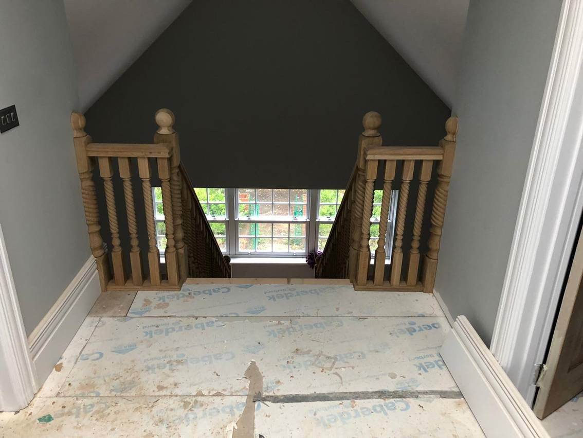 A beautiful example of a concrete staircase fitted to an exclusive property in Eversley that we were tasked to clad in Oak and softwood to match the character of the property. As you can see the results were quite simply stunning and the developer was delighted with the attention to detail and care taken by our fitters to achieve the overall effect.