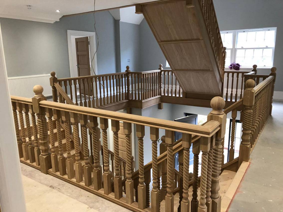 We supplied two beautiful solid oak staircases to a prestigious new build property in Crowthorne, Berkshire. The specification chosen by the client included stop chamfered newels, specially machined twist style spindles and a bottom volute to the curtail tread. In addition we supplied matching oak panelling to the underside of the flights to complete the elegant look.