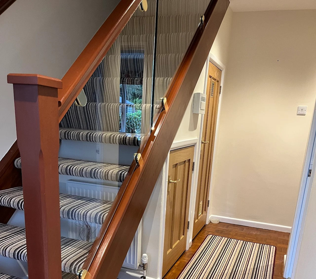Beautiful Oak and glass balustrade flight with chrome clamps and contemporary stop chamfered newels, supplied to a property in Finchampstead